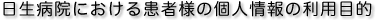 患者様情報の収集は、診療・看護・事務・管理運営等「日生病院における患者様の個人情報の利用目的」に記載の範囲で行います。その他の目的で個人情報を利用する場合は利用目的を予めお知らせし、ご了解を得た上で実施いたします。ウェブサイトで個人情報を必要とする場合も同様にいたします。 |